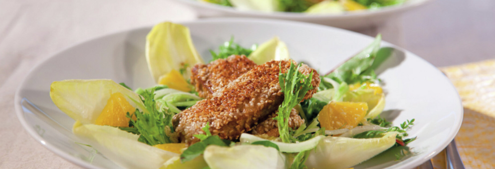 Knusprig gebratener Sesam-Tofu trifft auf einen fruchtig-frischen Salat mit Orange und Ingwer-Dressing.